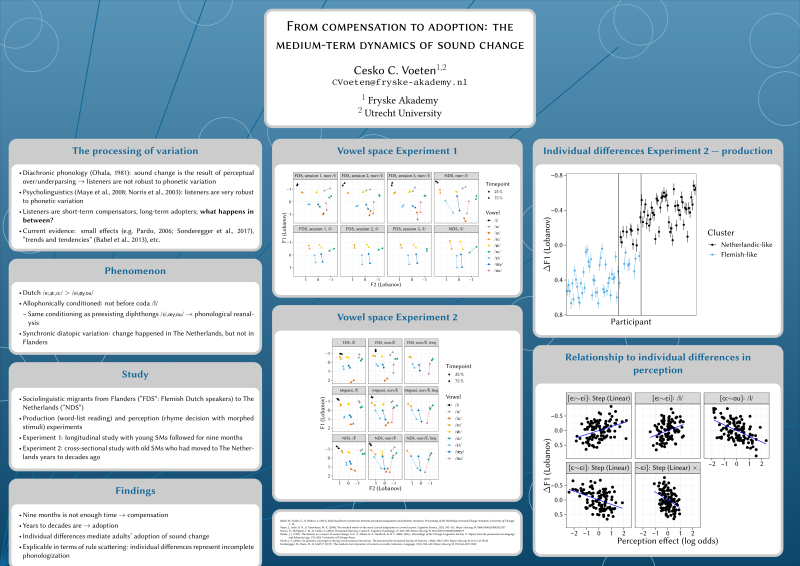 From compensation to adoption: the medium-term dynamics of sound change By Cesko C. Voeten Abstract Poster Click or tap to enlarge. Video Click or tap to watch. Questions and comments